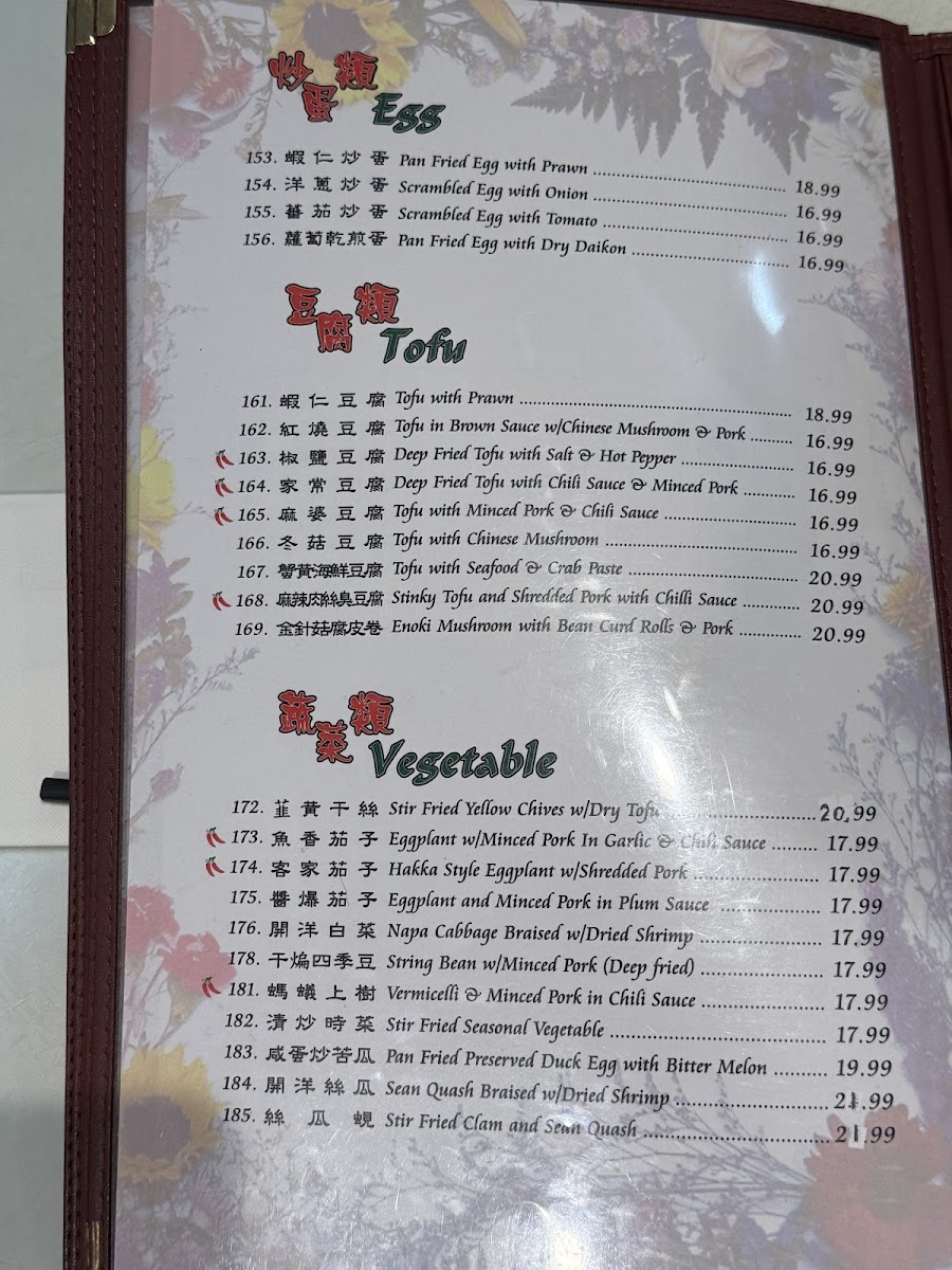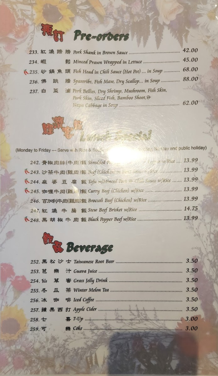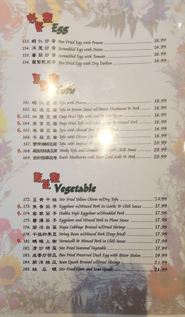 Other Specialty Dishes: A range of items such as minced prawn wrapped in lettuce, spareribs with fish maw and dry scallop soup, pork shank in brown sauce, and several tofu preparations including deep-fried tofu and stinky tofu with shredded pork in chili sauce. These selections provide a variety of flavors and textures, reflecting regional cooking styles.