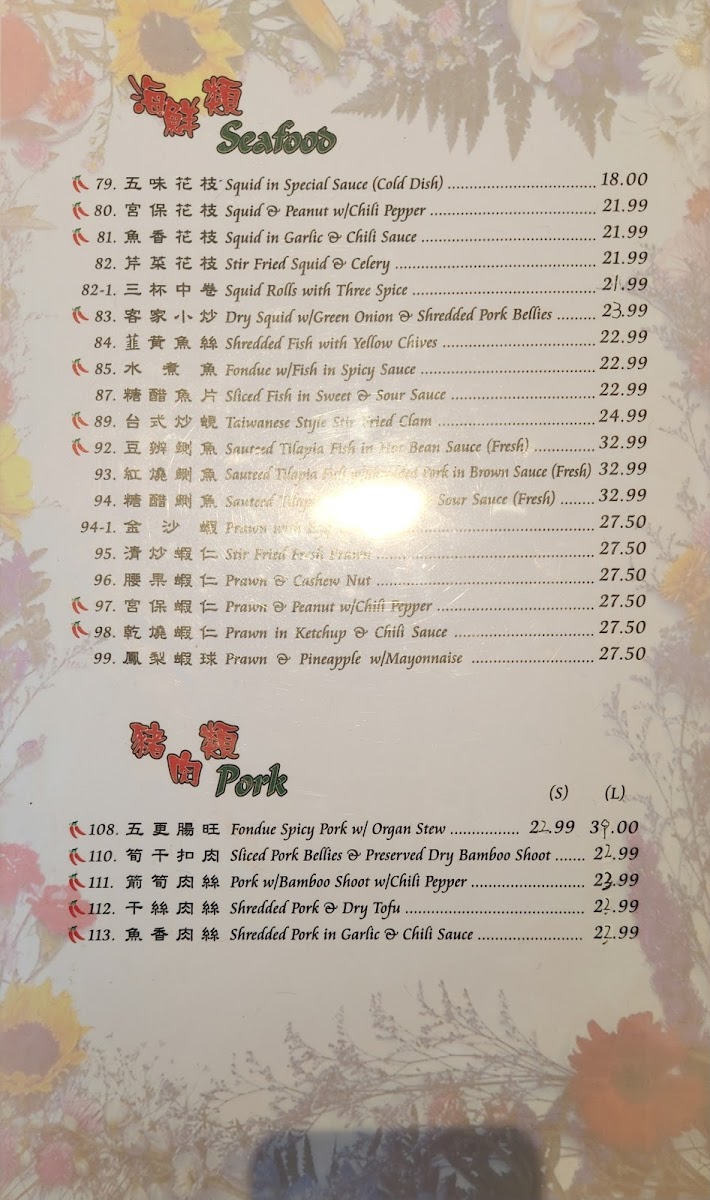 The menu offers a diverse selection of Taiwanese, Chinese, and Sichuan cuisine, featuring a variety of traditional and regional dishes. It is structured into several categories to help guests easily navigate their choices.